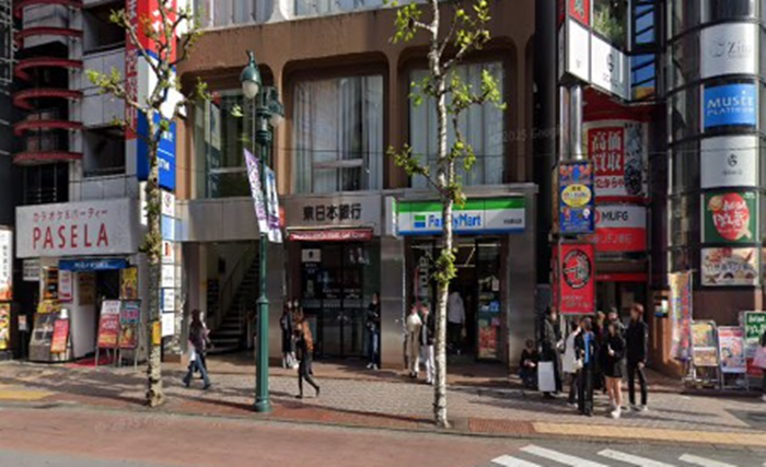 三菱UFJ銀行とファミリーマートを通り過ぎた先の東日本銀行が1階にある