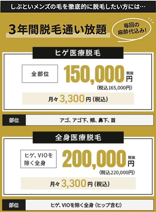 | 全身医療脱毛 | 3年間通い放題 | 220,000円 | ヒゲ、VIOを除く全身 |